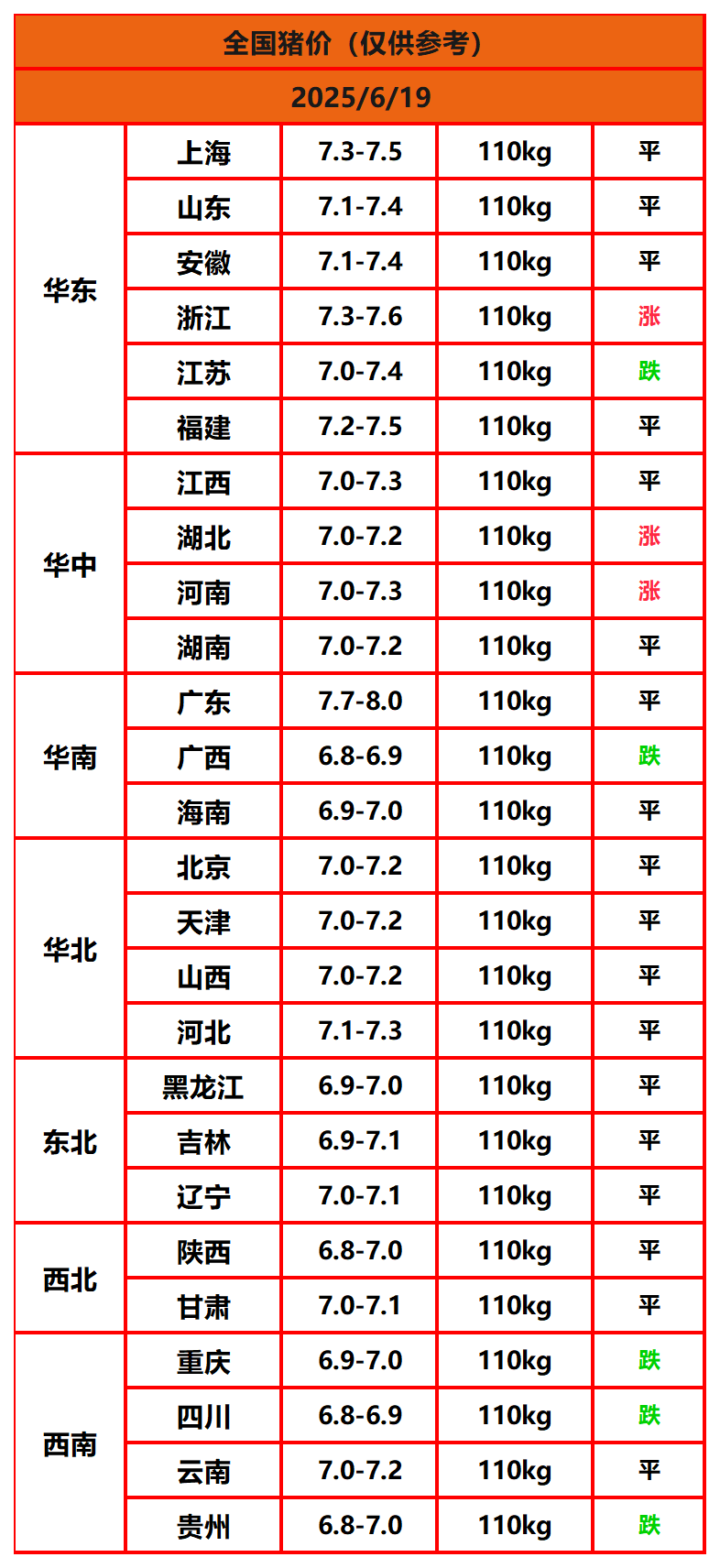 2025年6月19日猪价,今日全国猪价行情走势:3涨18平5跌。