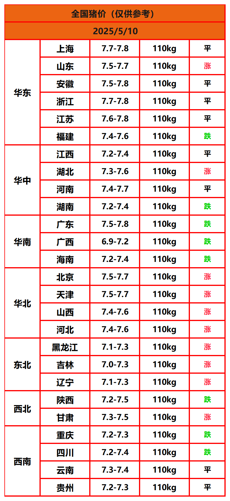 2025年5月10日猪价,今日全国猪价行情走势:10涨8平8跌。