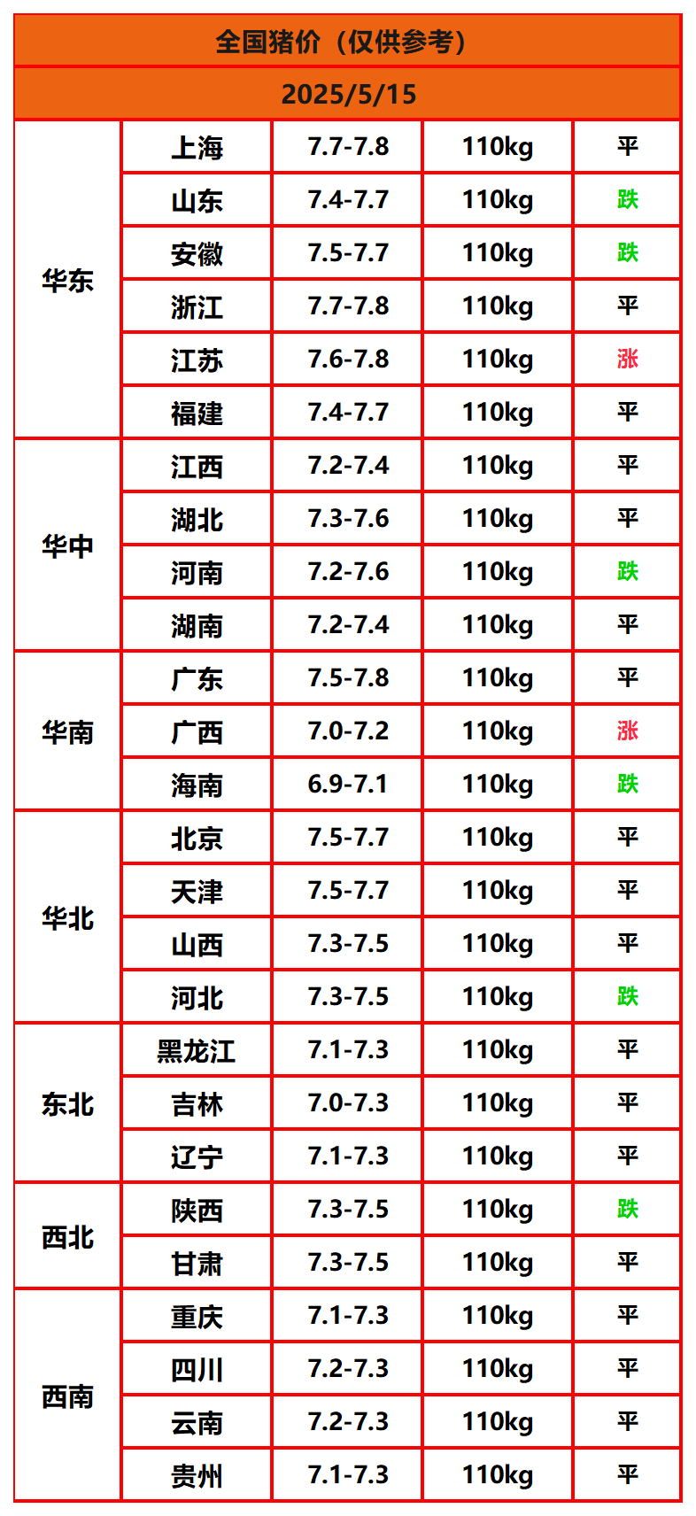 2025年5月15日猪价,今日全国猪价行情走势:2涨18平6跌。