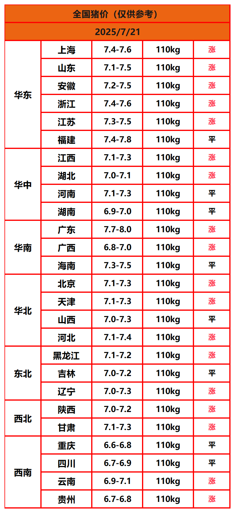 2025年7月21日猪价,今日全国猪价行情走势:18涨8平0跌。