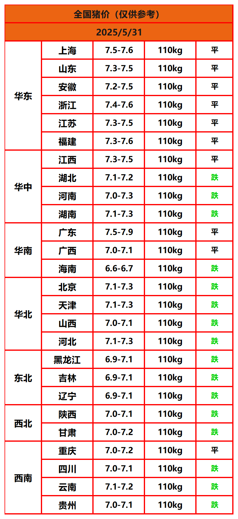 2025年5月30日猪价,今日全国猪价行情走势:3涨14平9跌。
